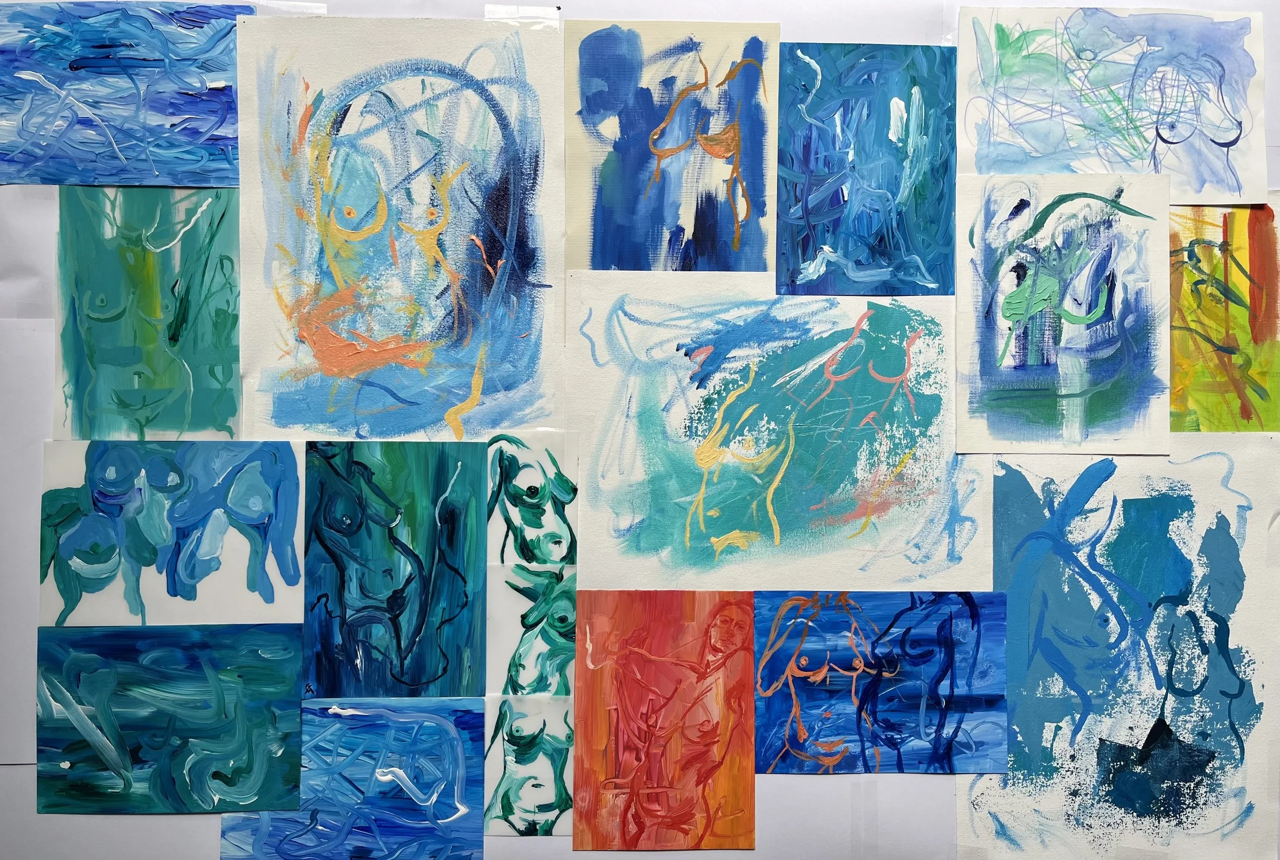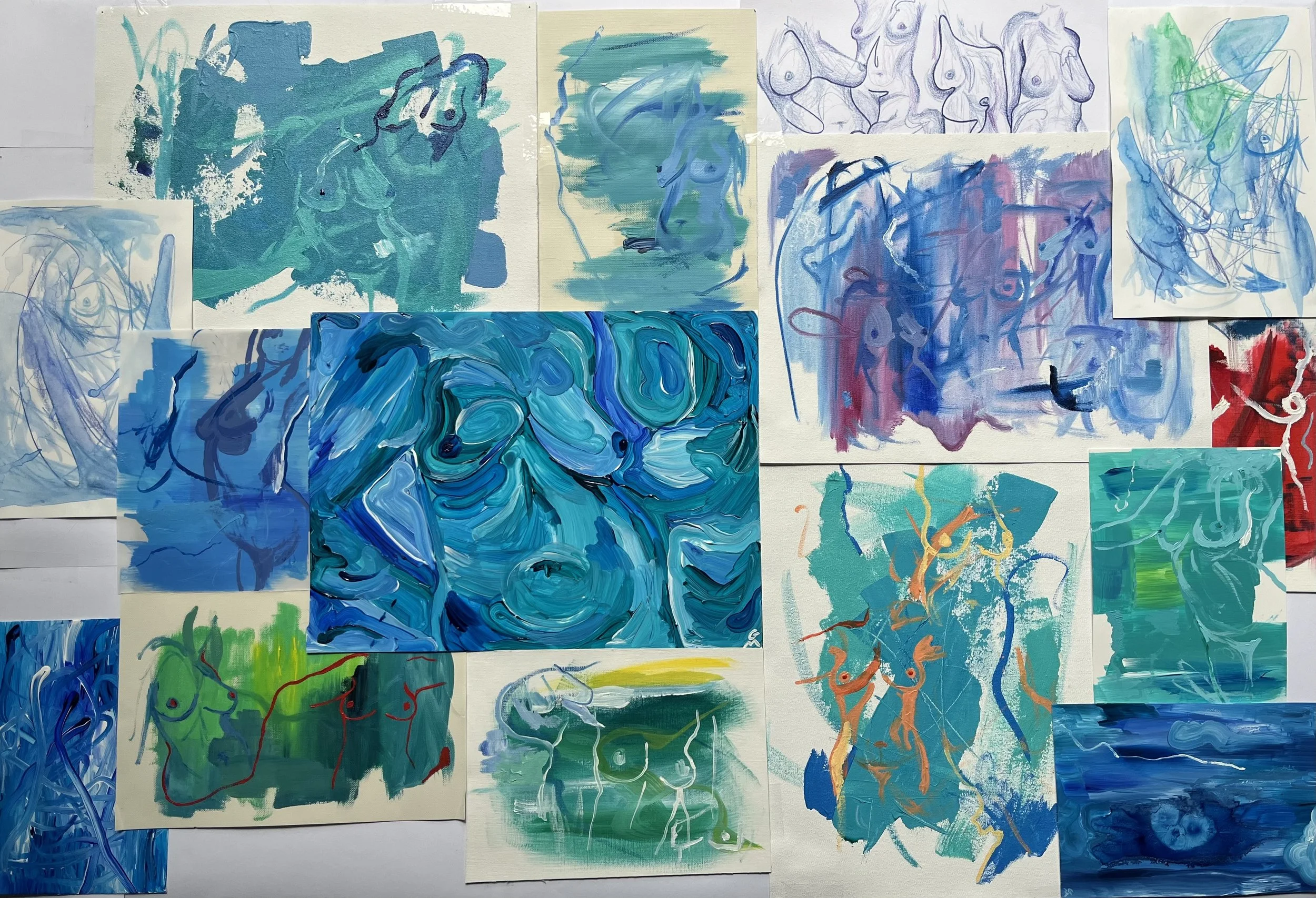 “Moving Myself Through the Blue” is a celebration of my movement through this season of my life as an artist, discovering the ever-long and ever-changing journey of expressing emotion, exercising control of my body, growing confidence, and ultimately finding myself. It explores the meaning of femininity and the image of the female body in art. On a personal level, I ask the questions: Who controls my movement? My femininity? My body? I do. I embrace myself, quite literally, in all that I am. I start my experimentation through feeling the emotions that music evokes, listening to my instincts, and painting through personal questions, doubt, and joy.